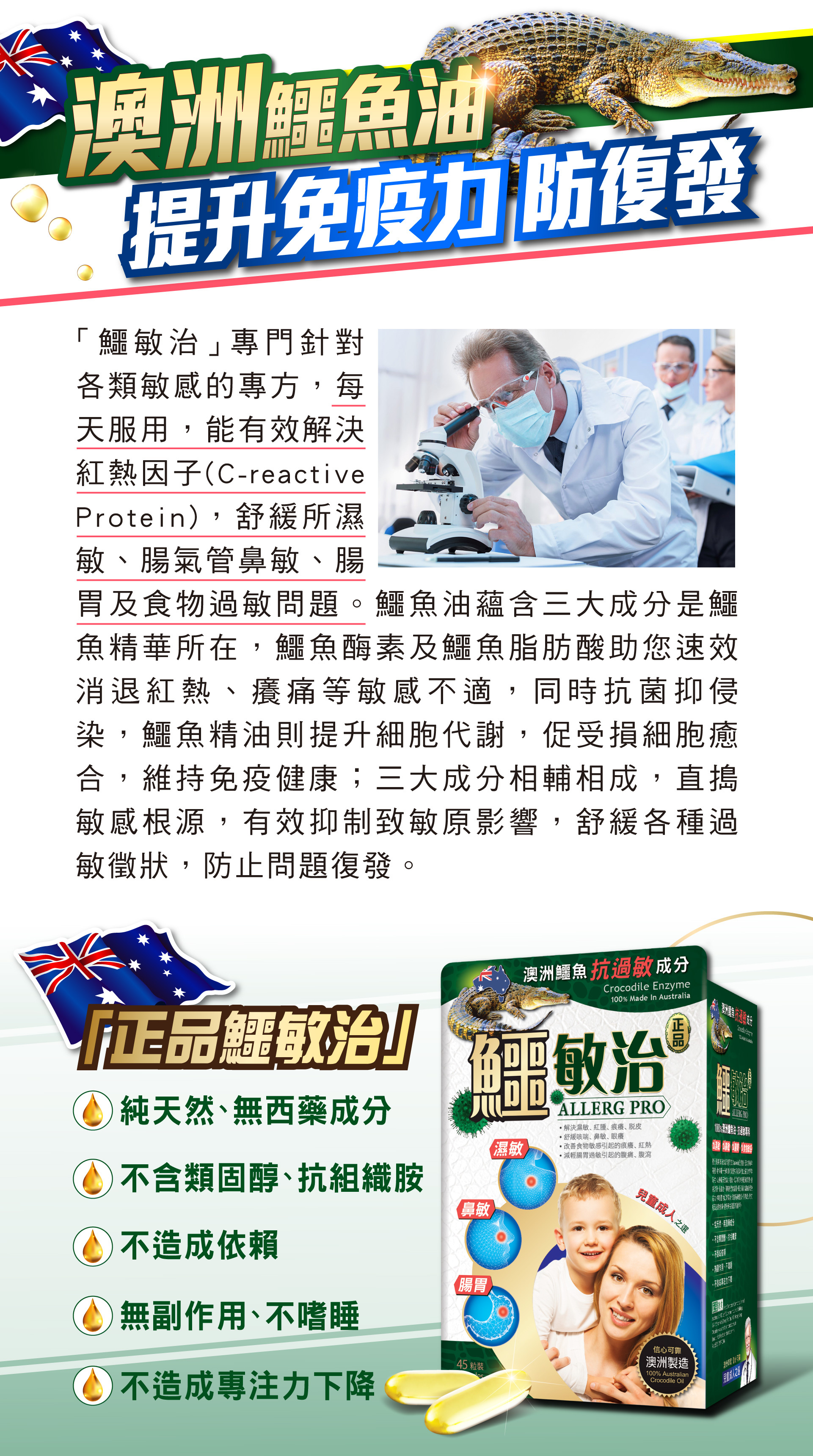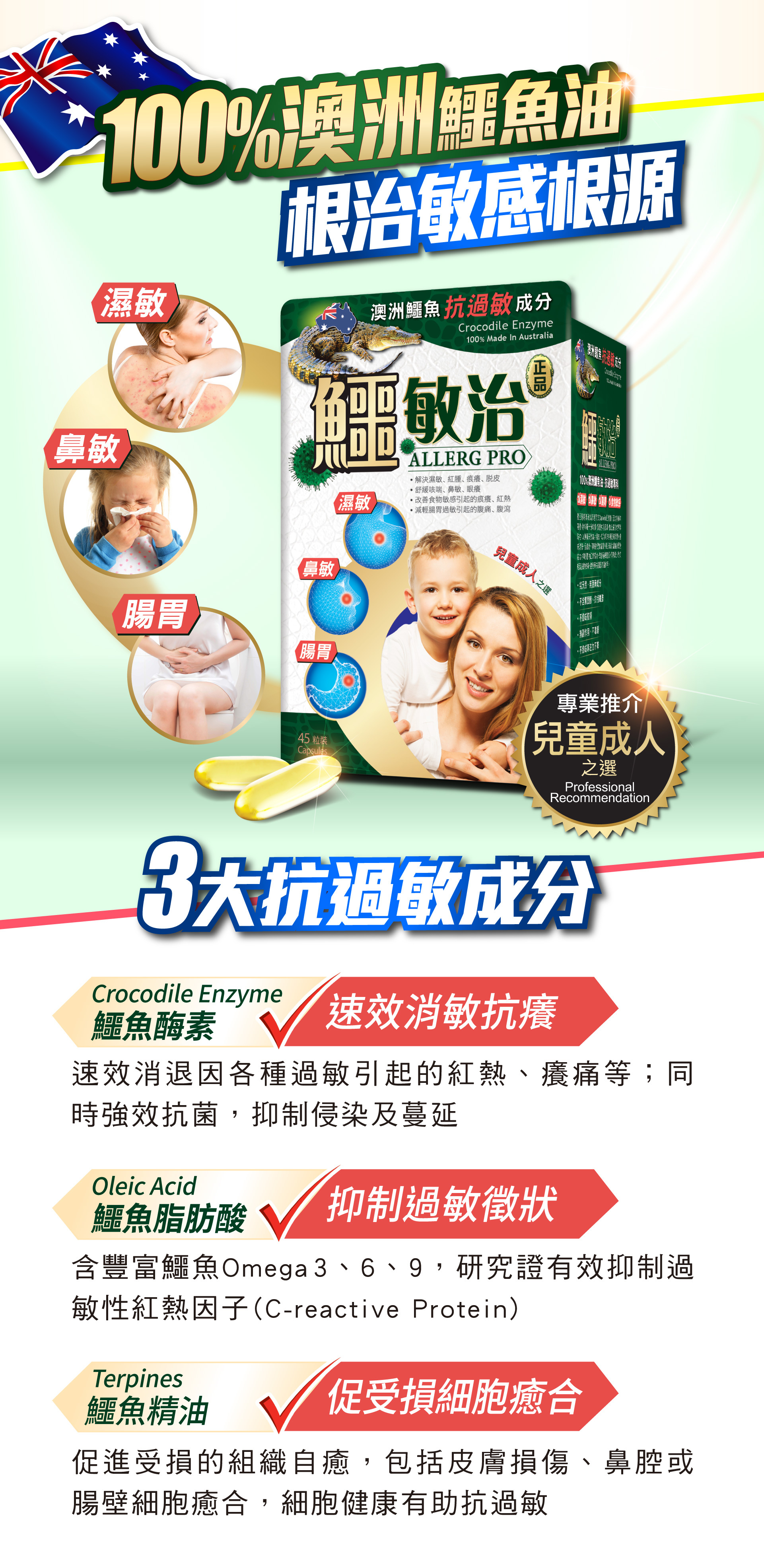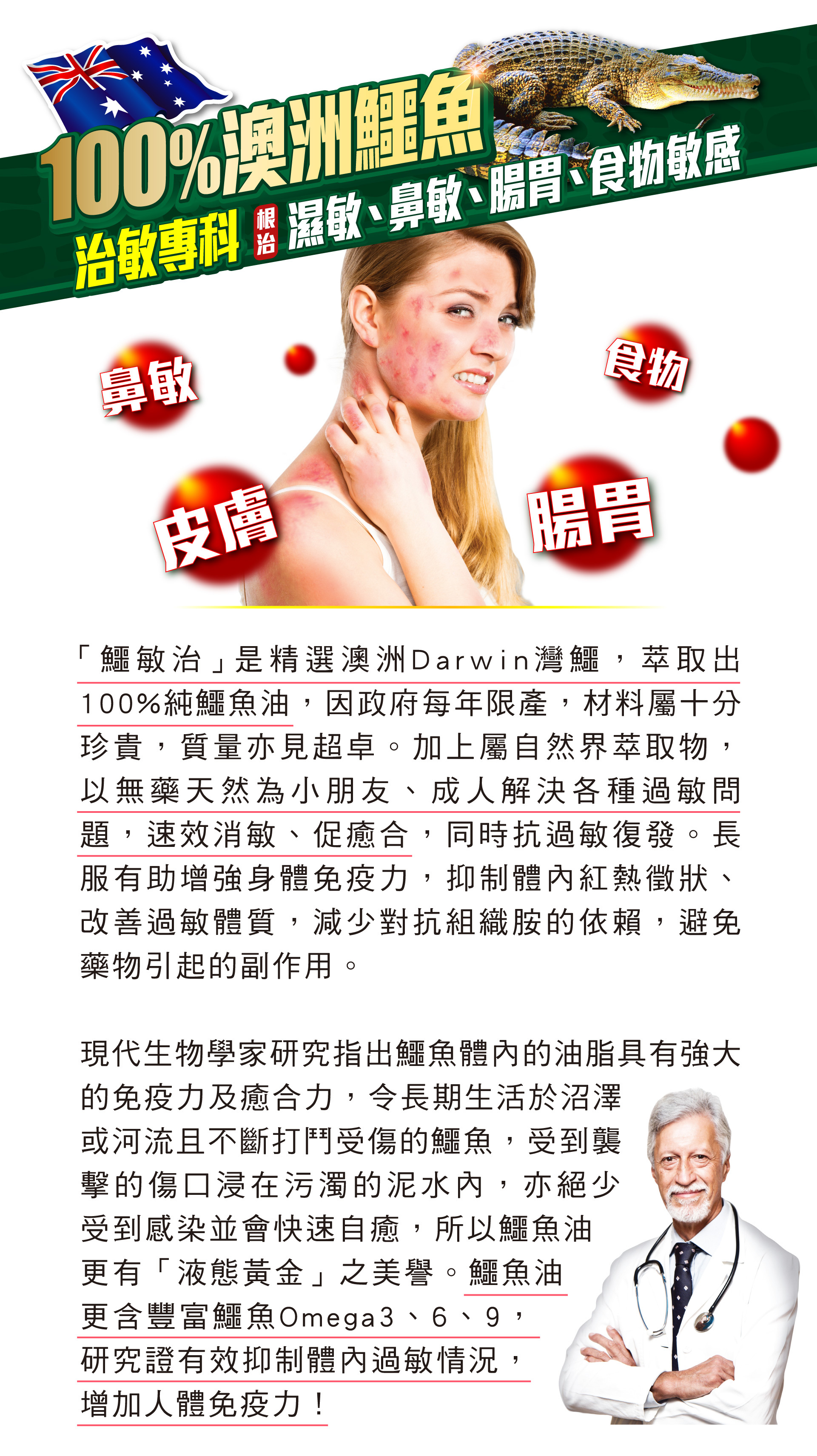 「正品鱷敏治」專門針對4大類常見敏感,能有效解決紅熱因子(C-reactive Protein),舒緩濕敏、氣管敏感、腸胃及食物過敏問題。成分天然,適合兒童成人服用。