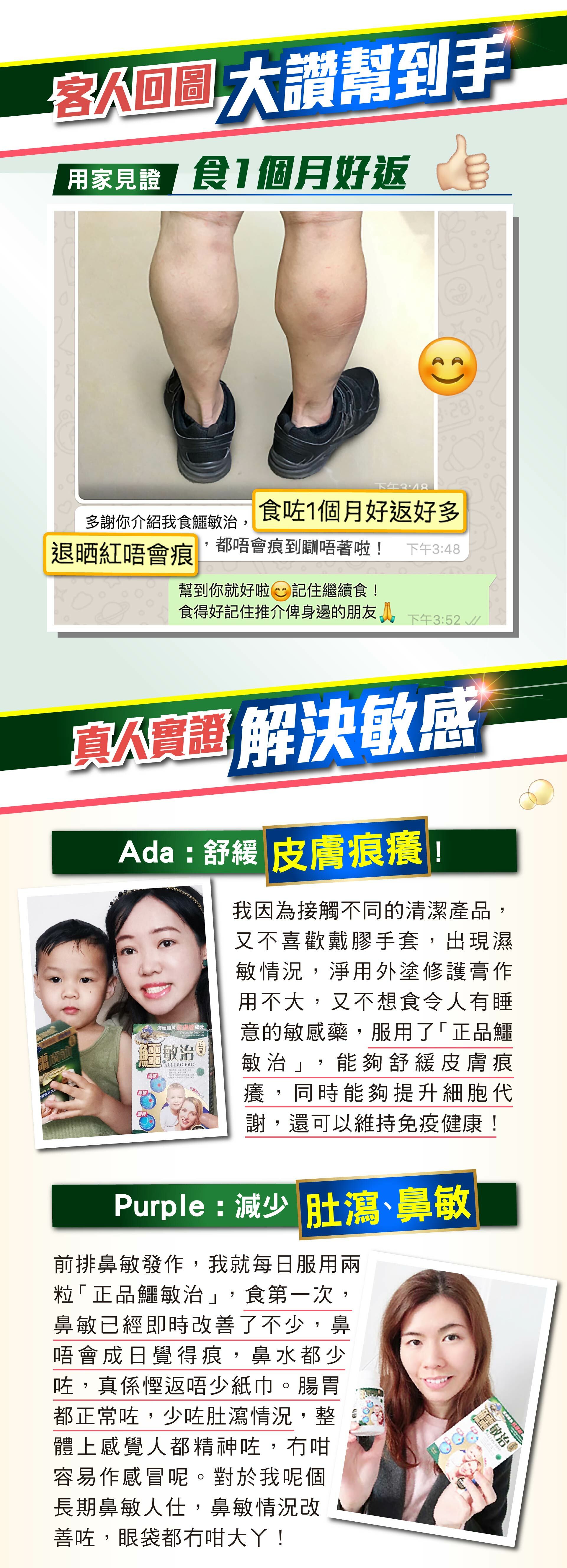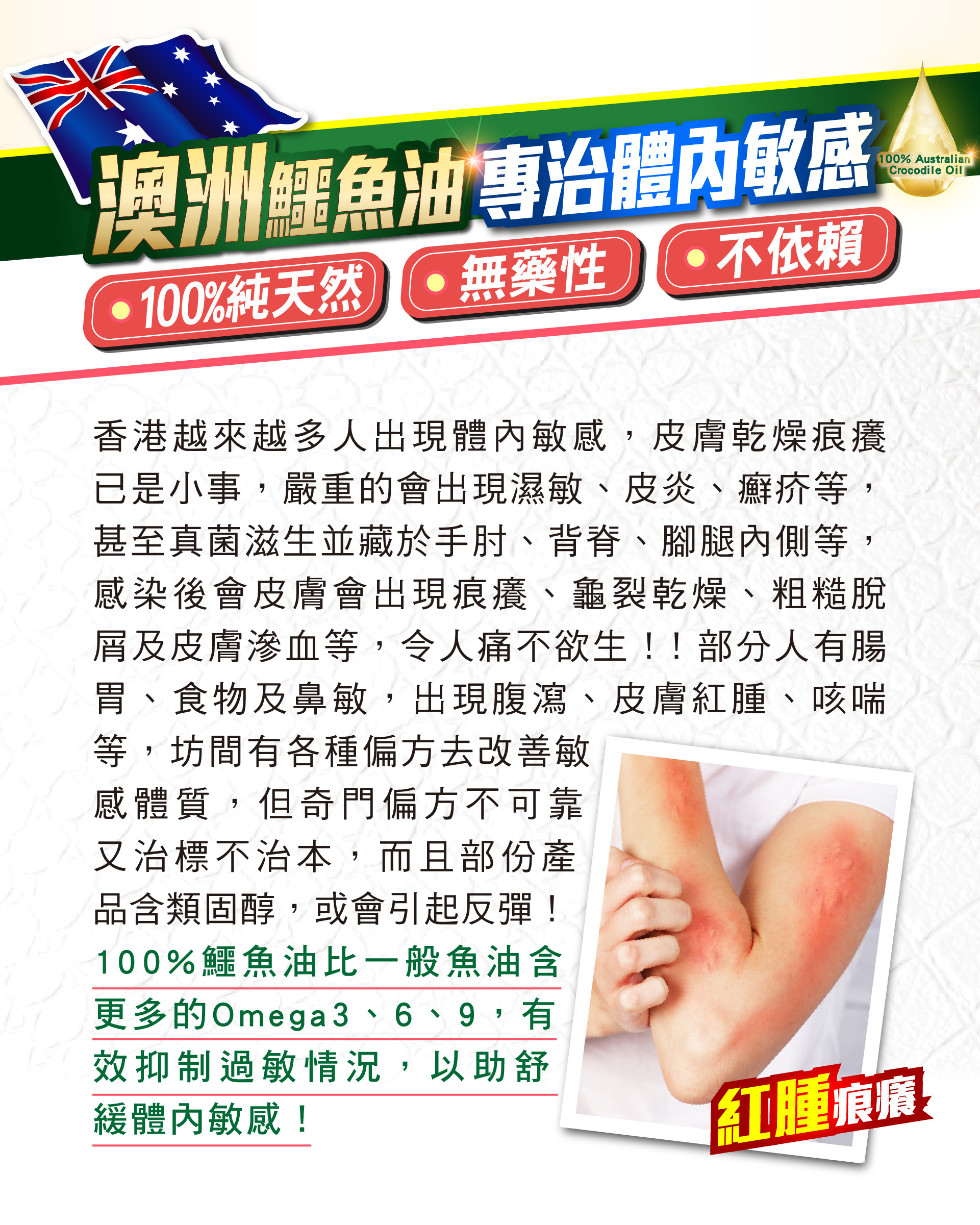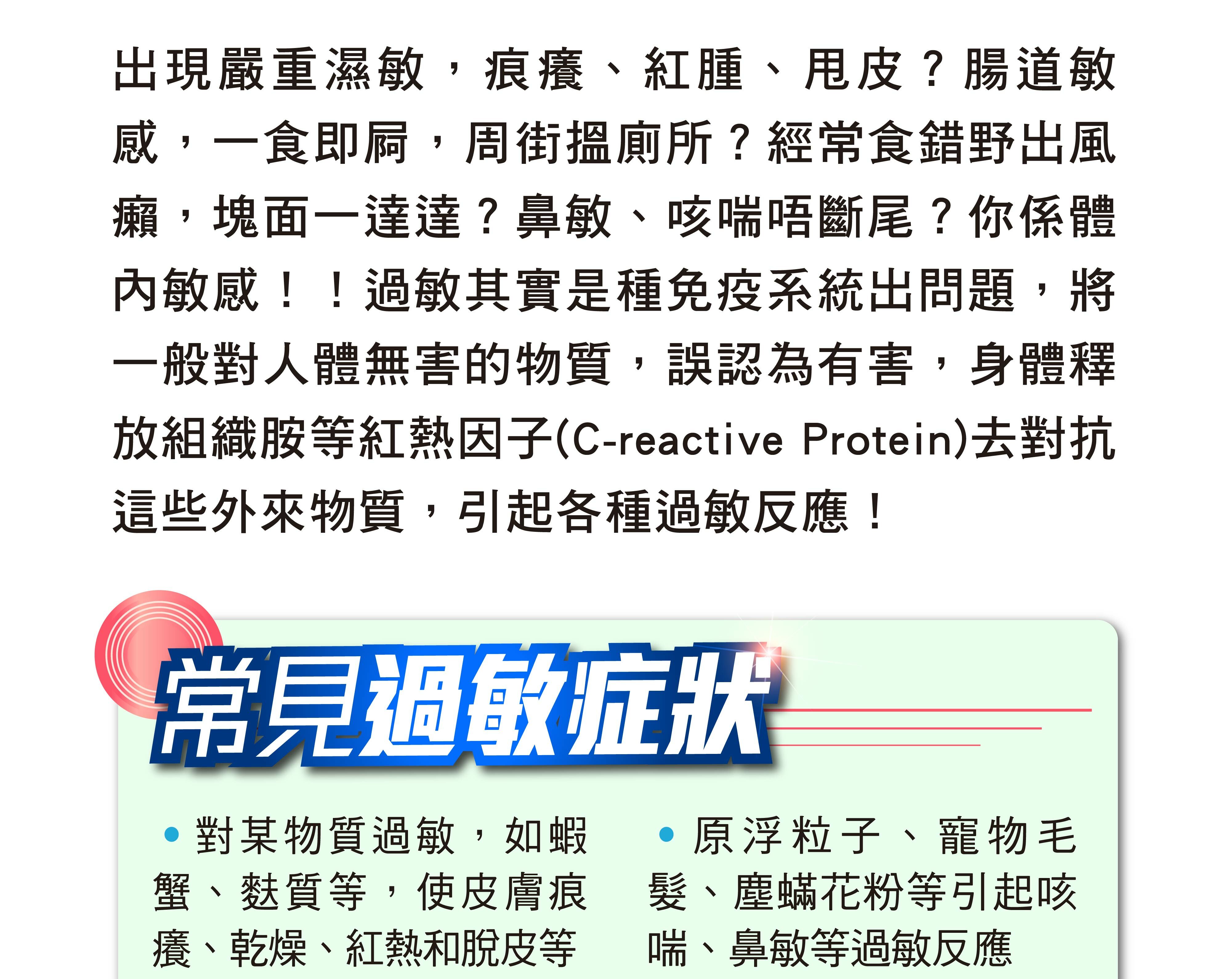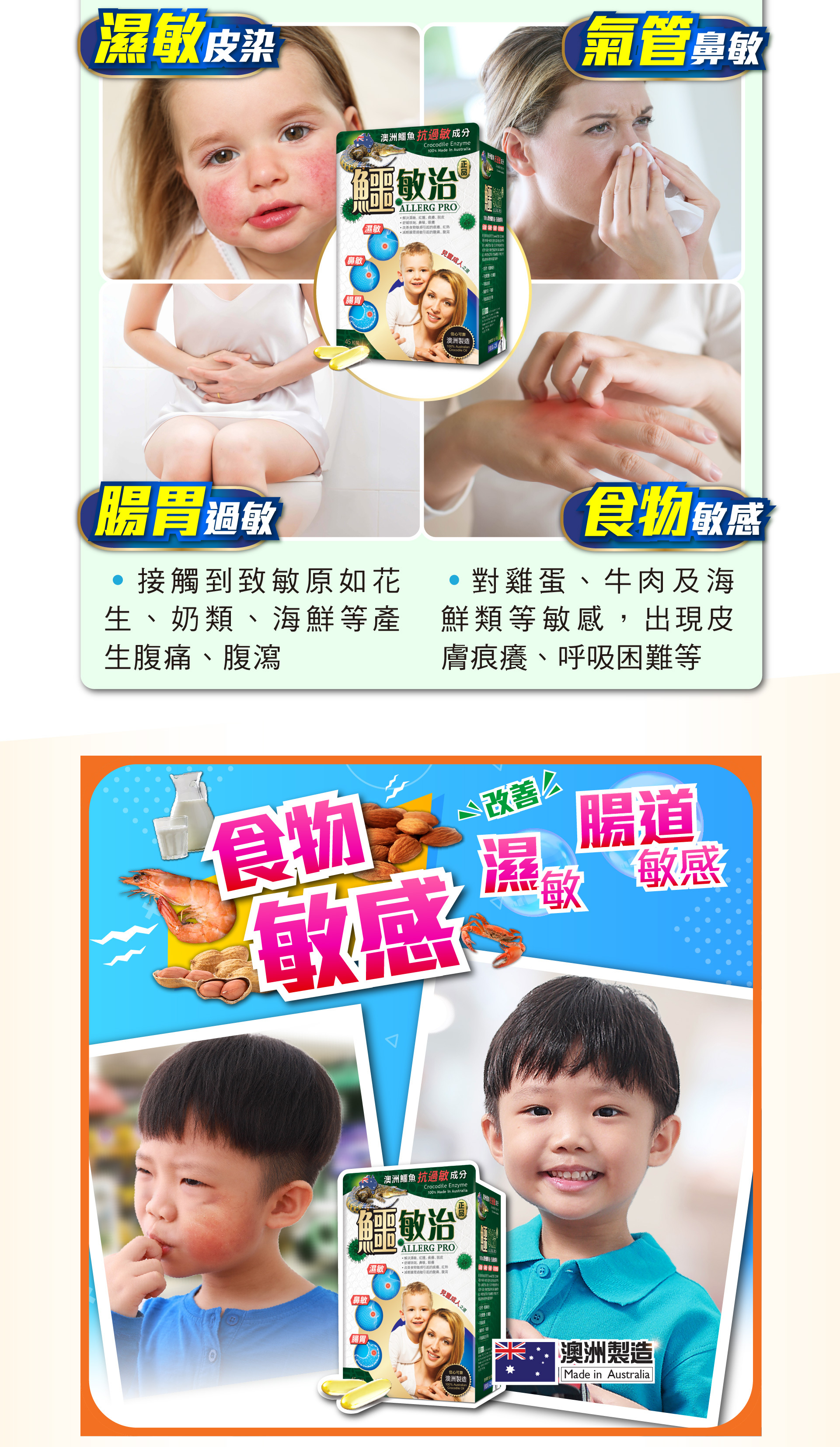 「正品鱷敏治」專門針對4大類常見敏感,能有效解決紅熱因子(C-reactive Protein),舒緩濕敏、氣管敏感、腸胃及食物過敏問題。成分天然,適合兒童成人服用。