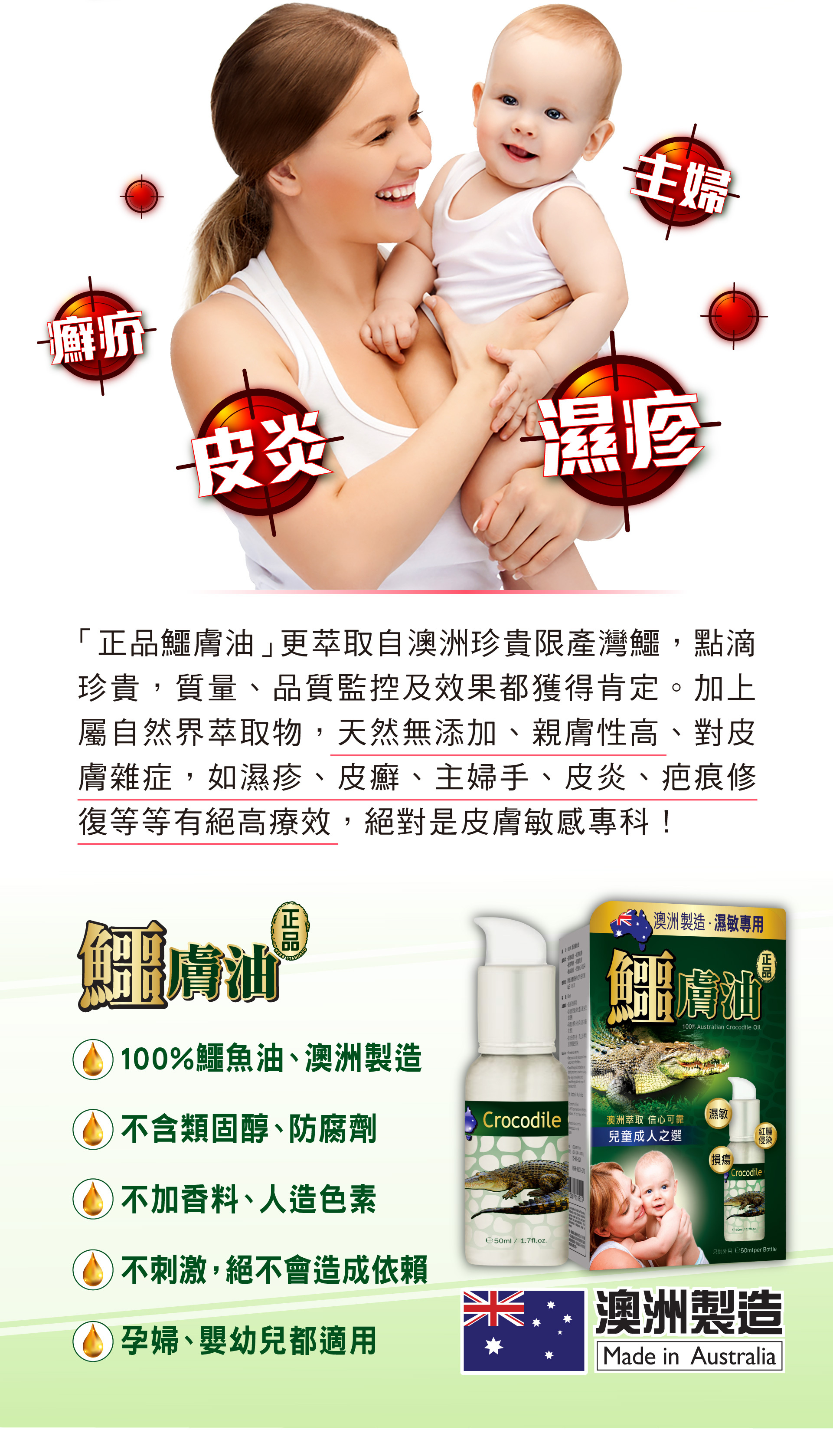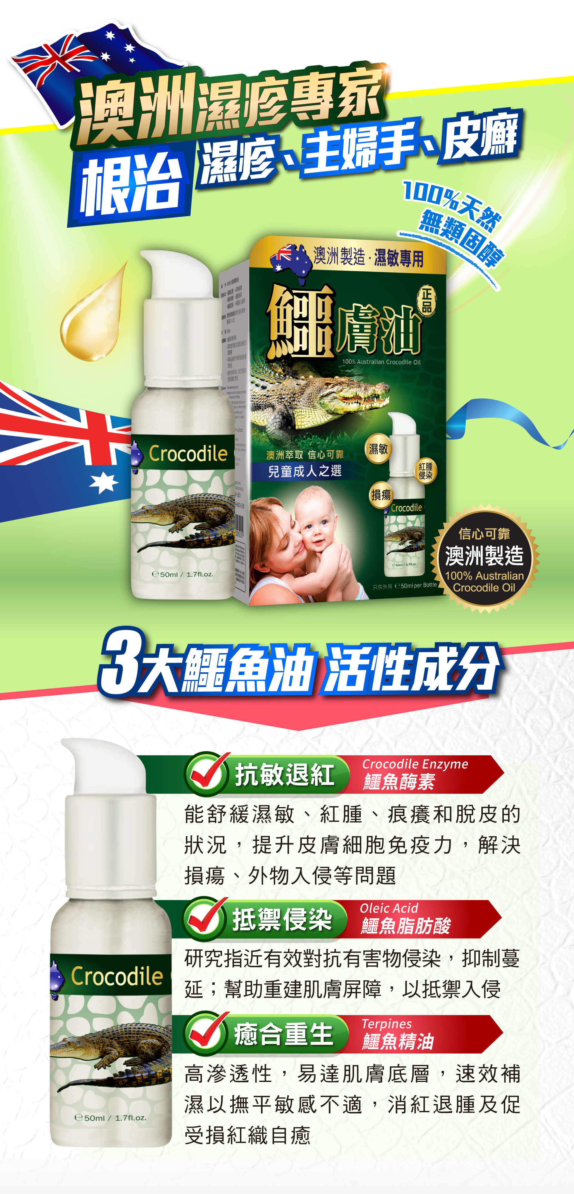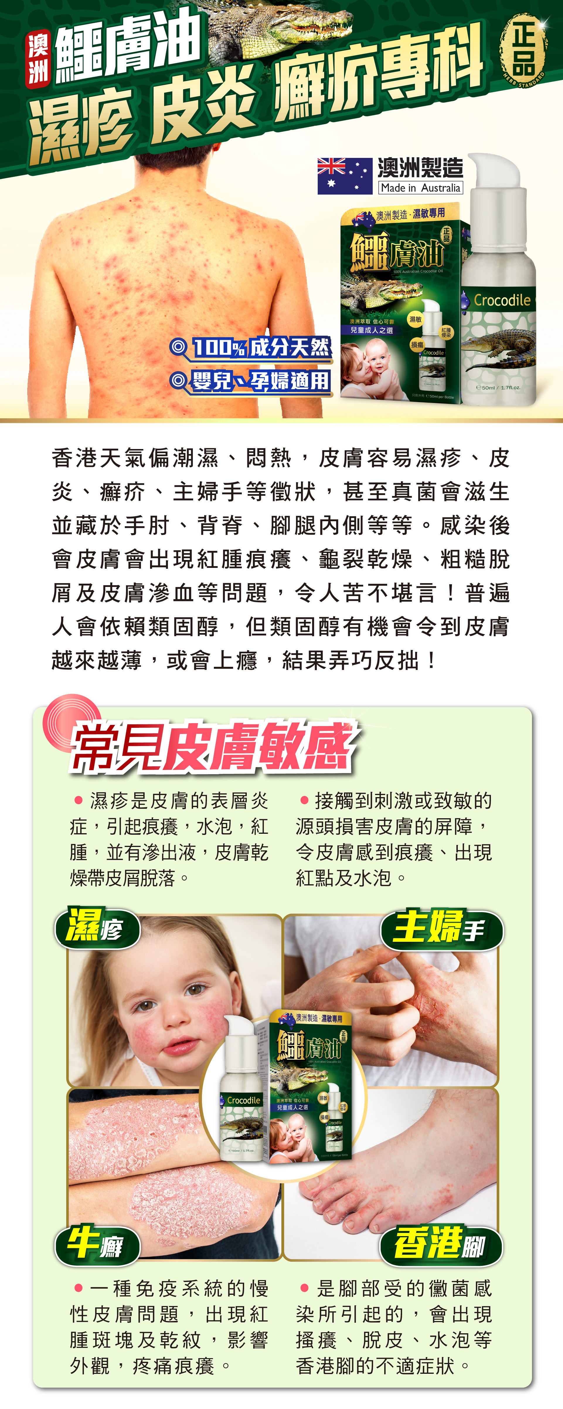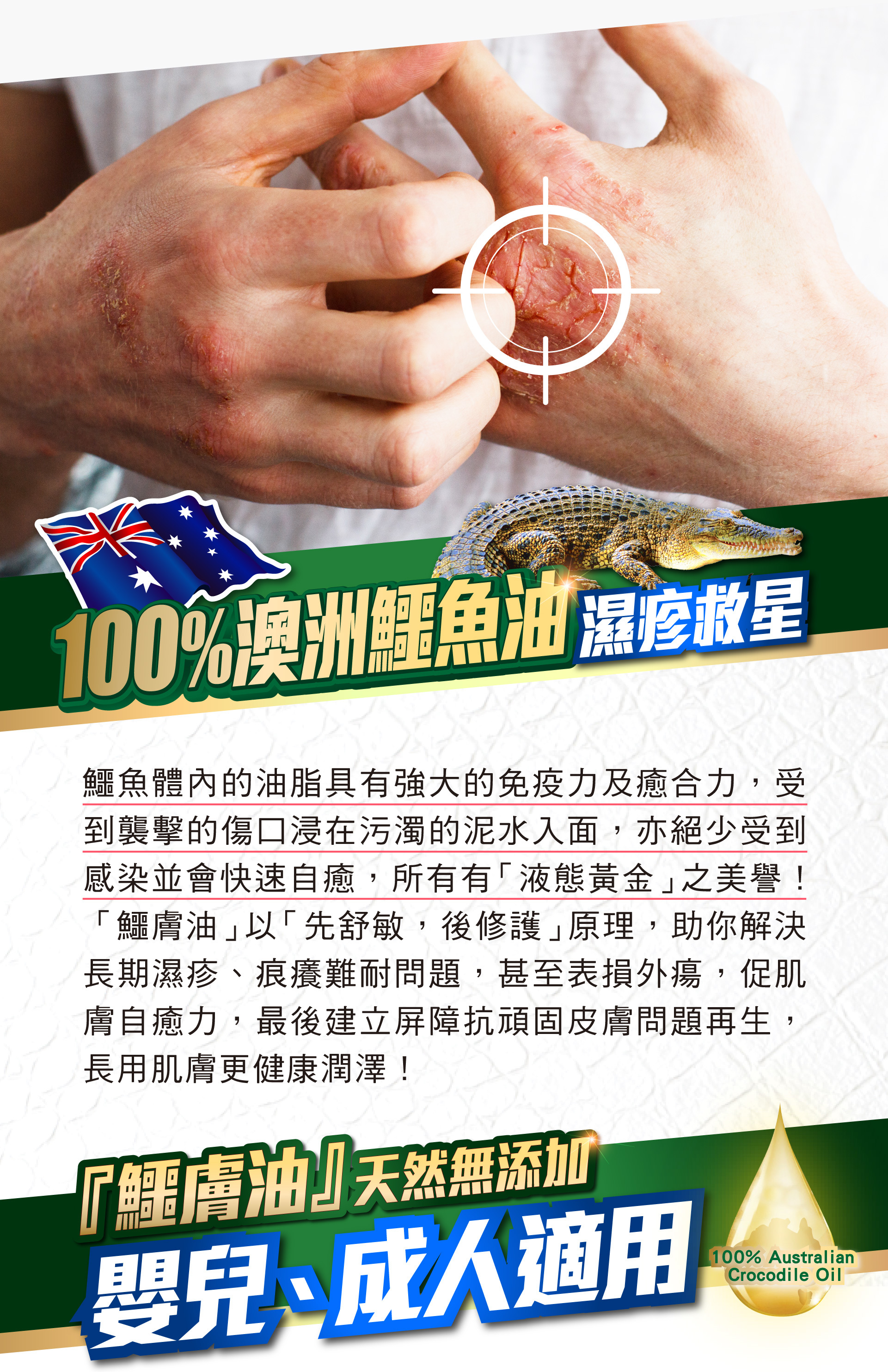 鱷膚油有「液態黃金」美譽,全因它含三大成分是鱷魚精華所在,令鱷魚不斷打鬥受傷,都迅速自我修復。鱷膚油以「先舒敏,後修護」原理,解決長期濕敏、痕癢難耐問題,甚至表損外瘍,促肌膚自療力,最後建立屏障抗頑固皮膚問題再生,長用肌膚更健康潤澤。