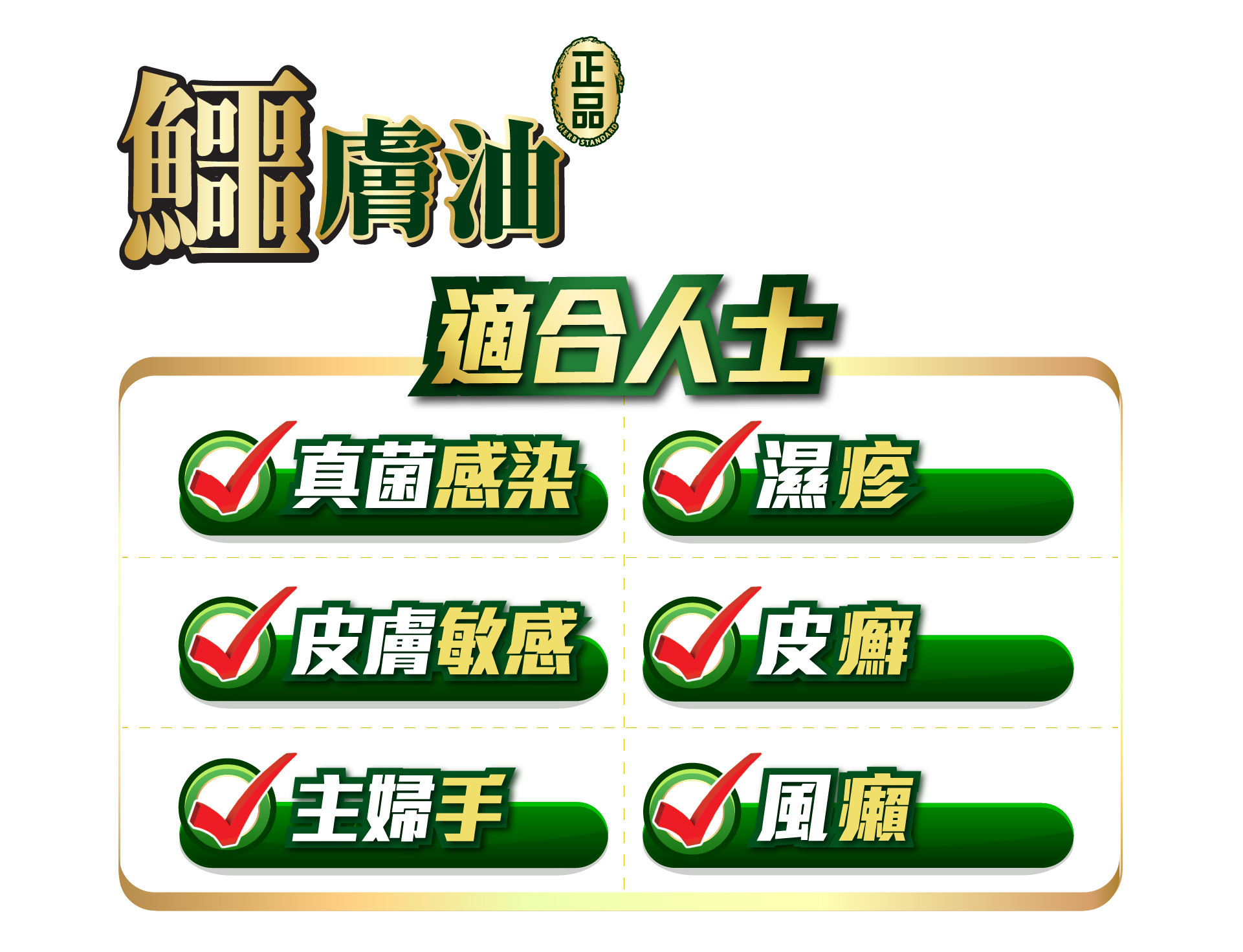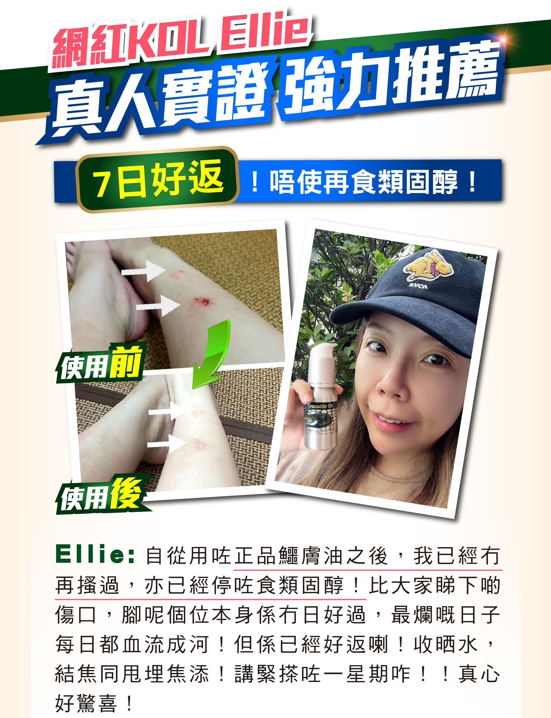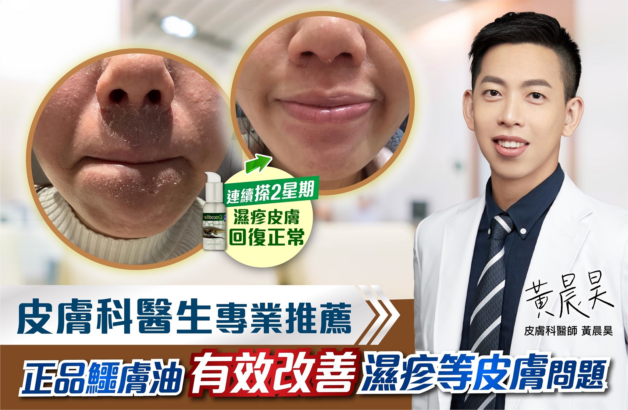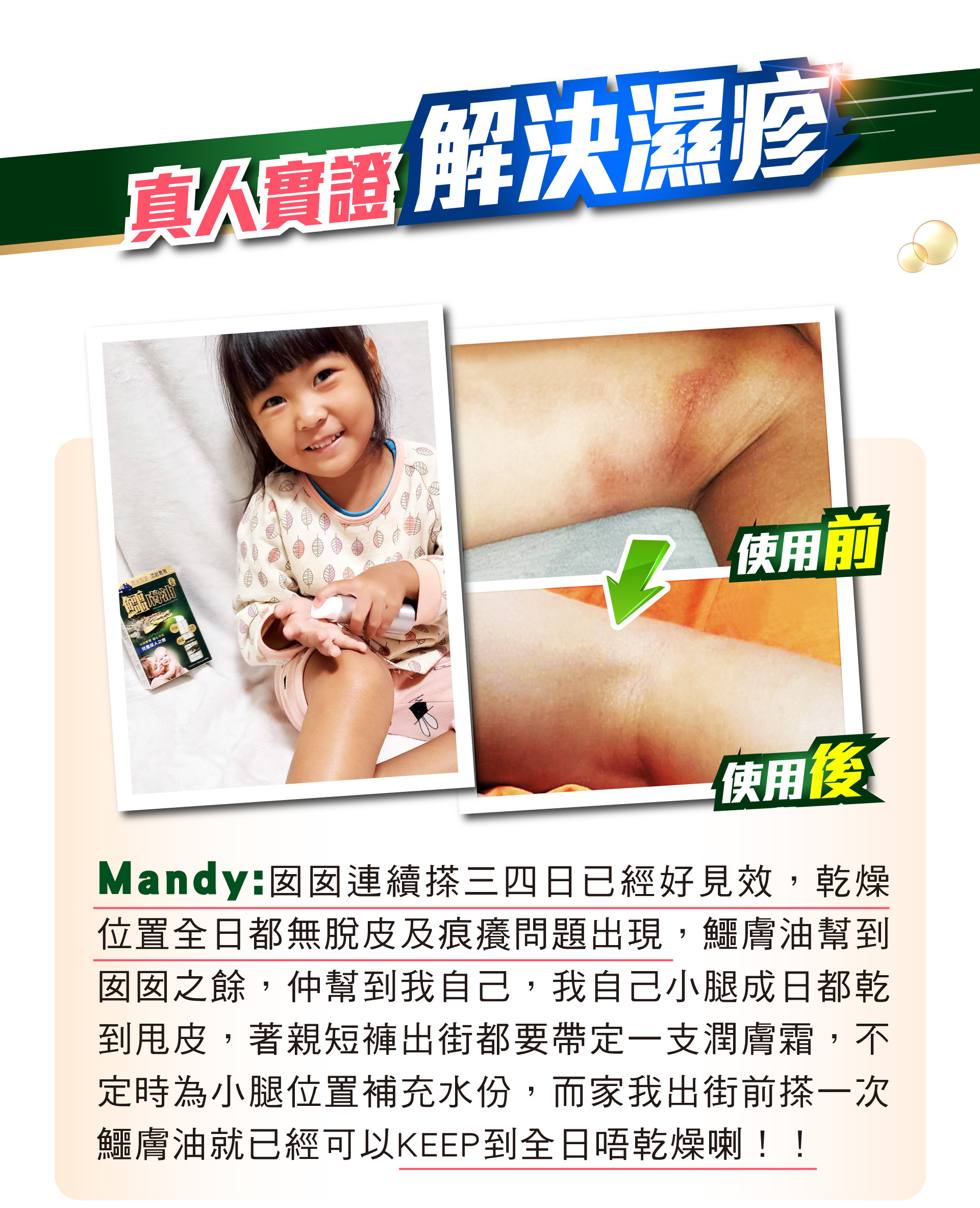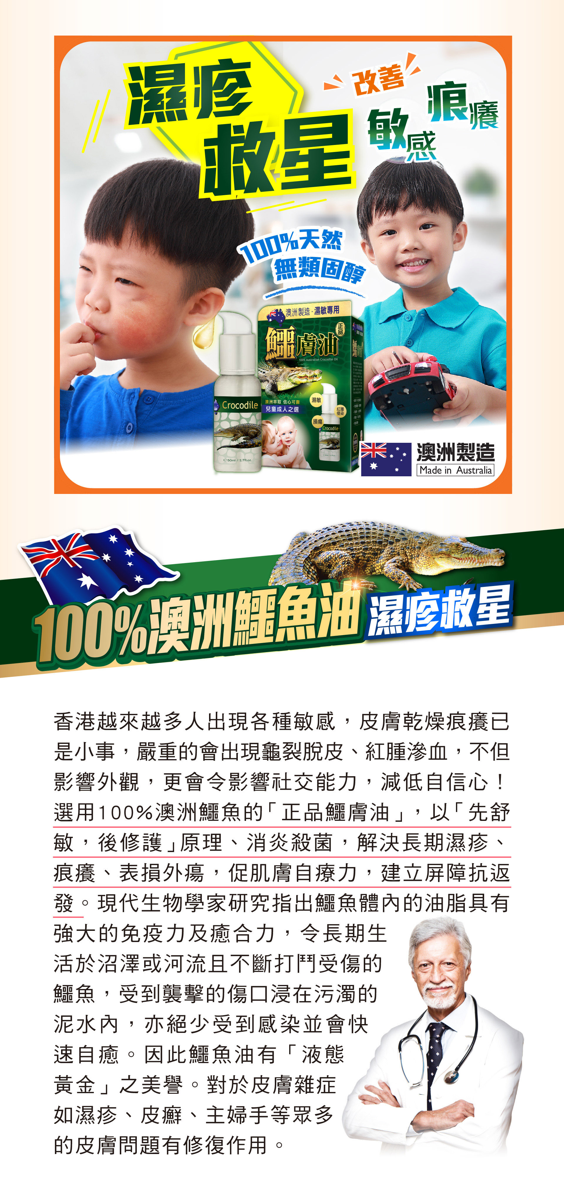 鱷膚油有「液態黃金」美譽,全因它含三大成分是鱷魚精華所在,令鱷魚不斷打鬥受傷,都迅速自我修復。鱷膚油以「先舒敏,後修護」原理,解決長期濕敏、痕癢難耐問題,甚至表損外瘍,促肌膚自療力,最後建立屏障抗頑固皮膚問題再生,長用肌膚更健康潤澤。