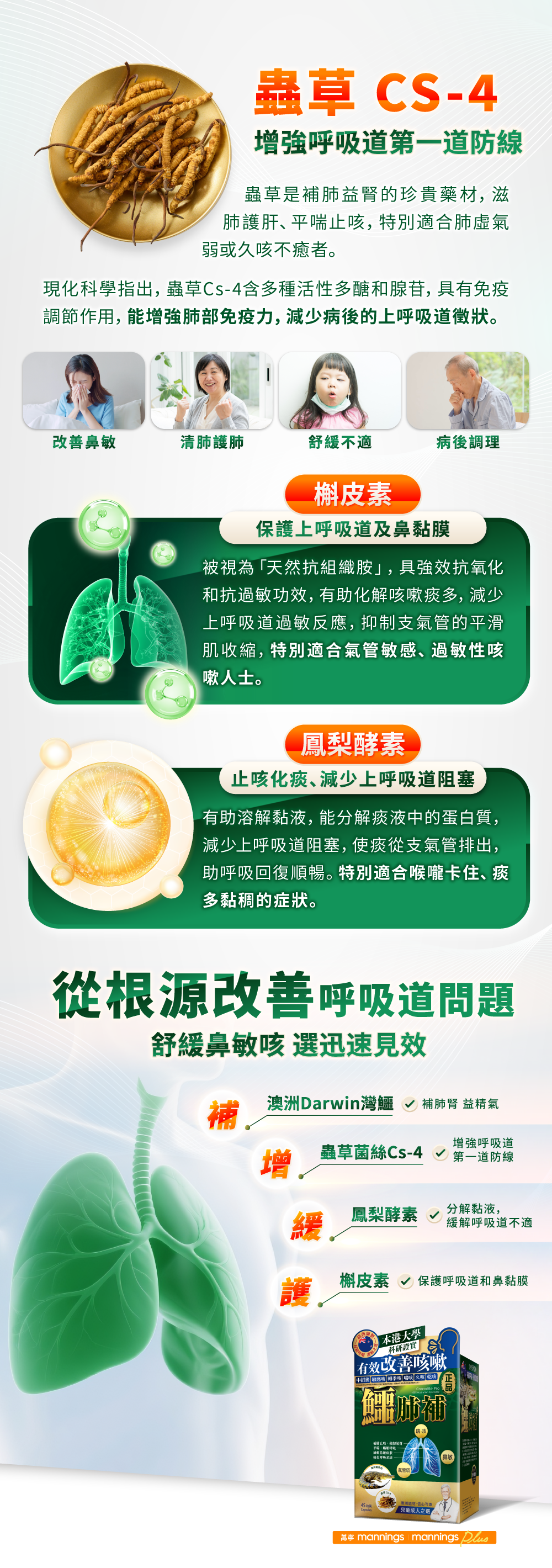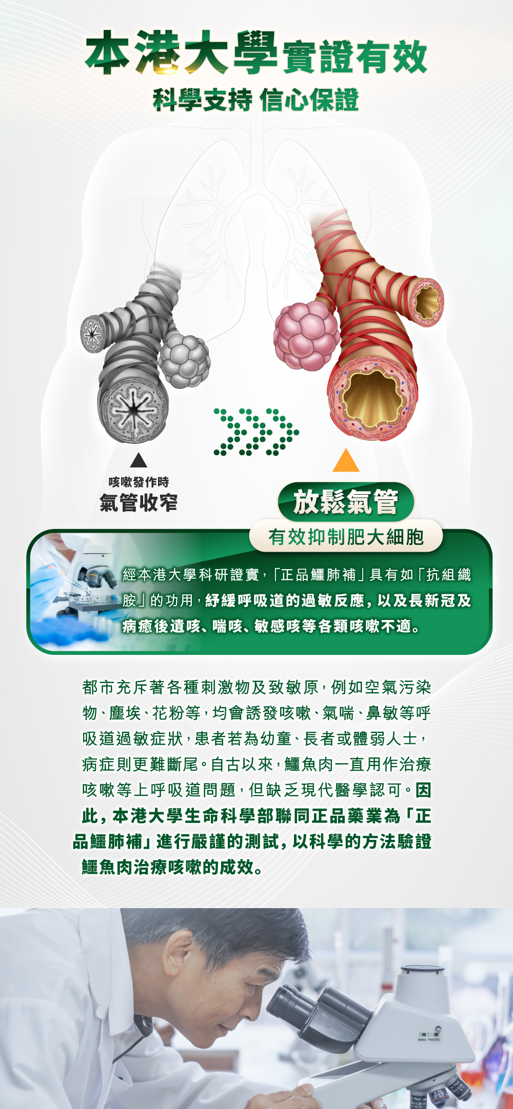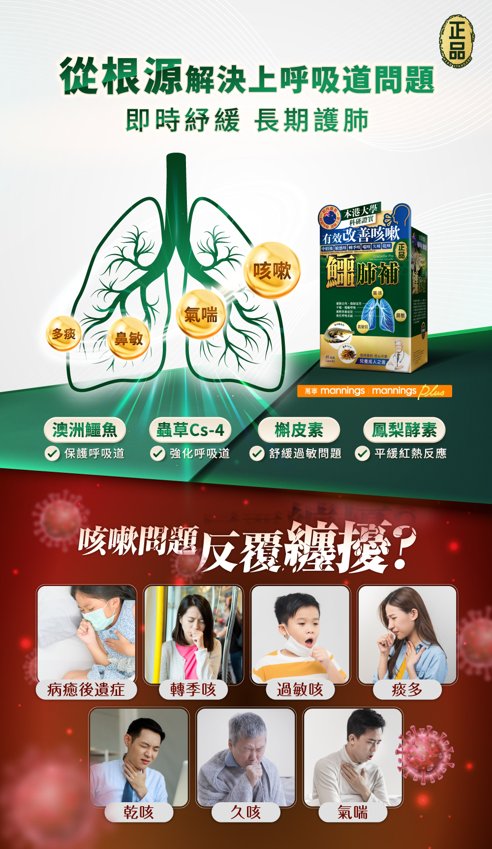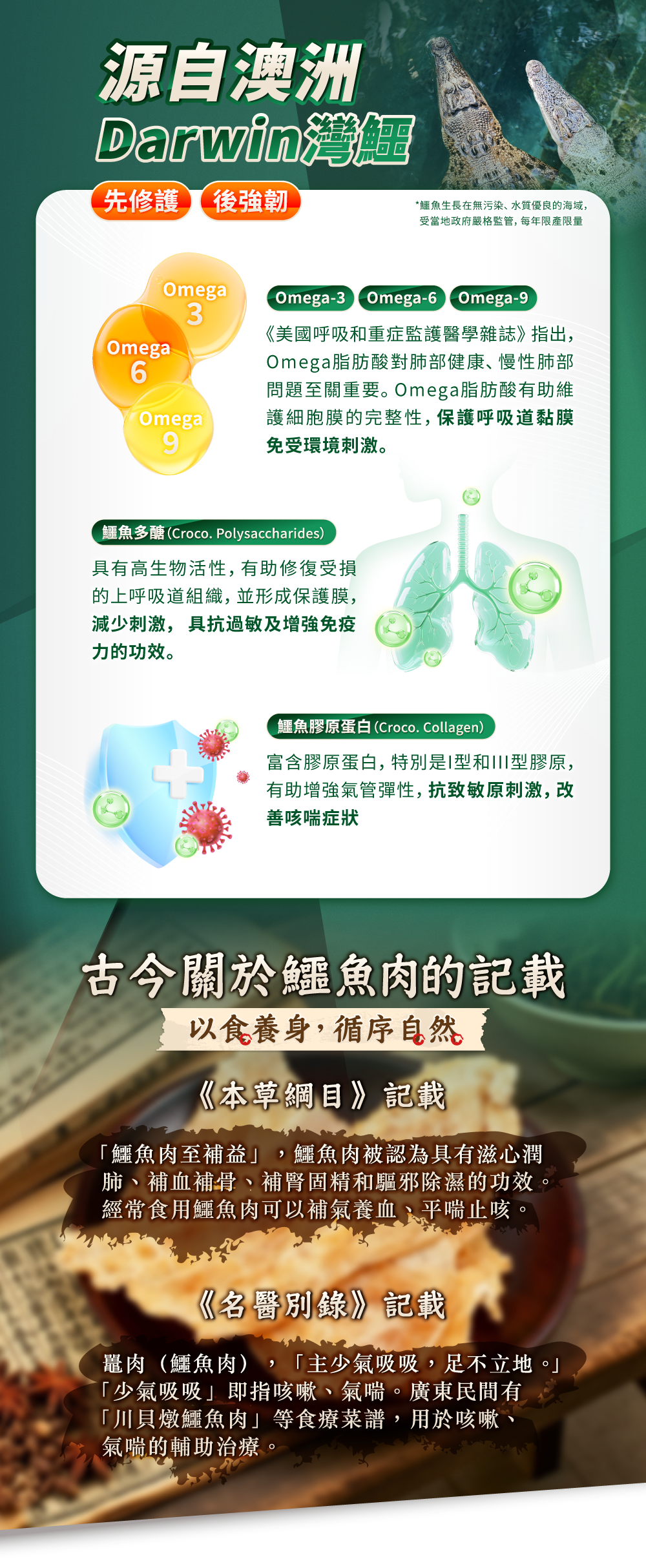 「正品鱷肺補」選用100%澳洲限產Darwin灣鱷,配以優質蟲草Cs-4、槲皮素及鳳梨酵素,經本港大學科研實證,有效止咳護肺。產品天然無藥性,6個月或以上的兒童、成人及長者均可安心服用。