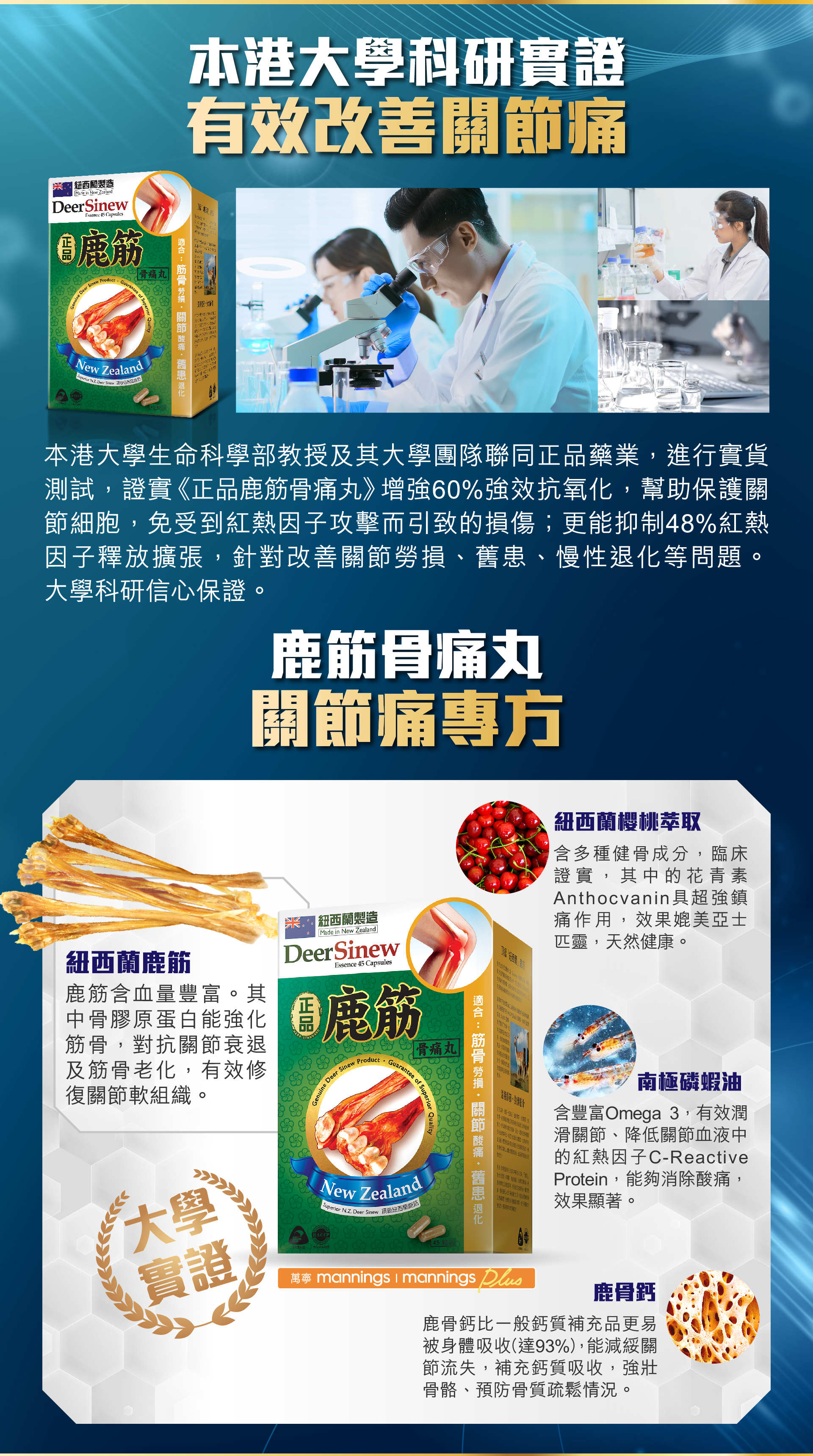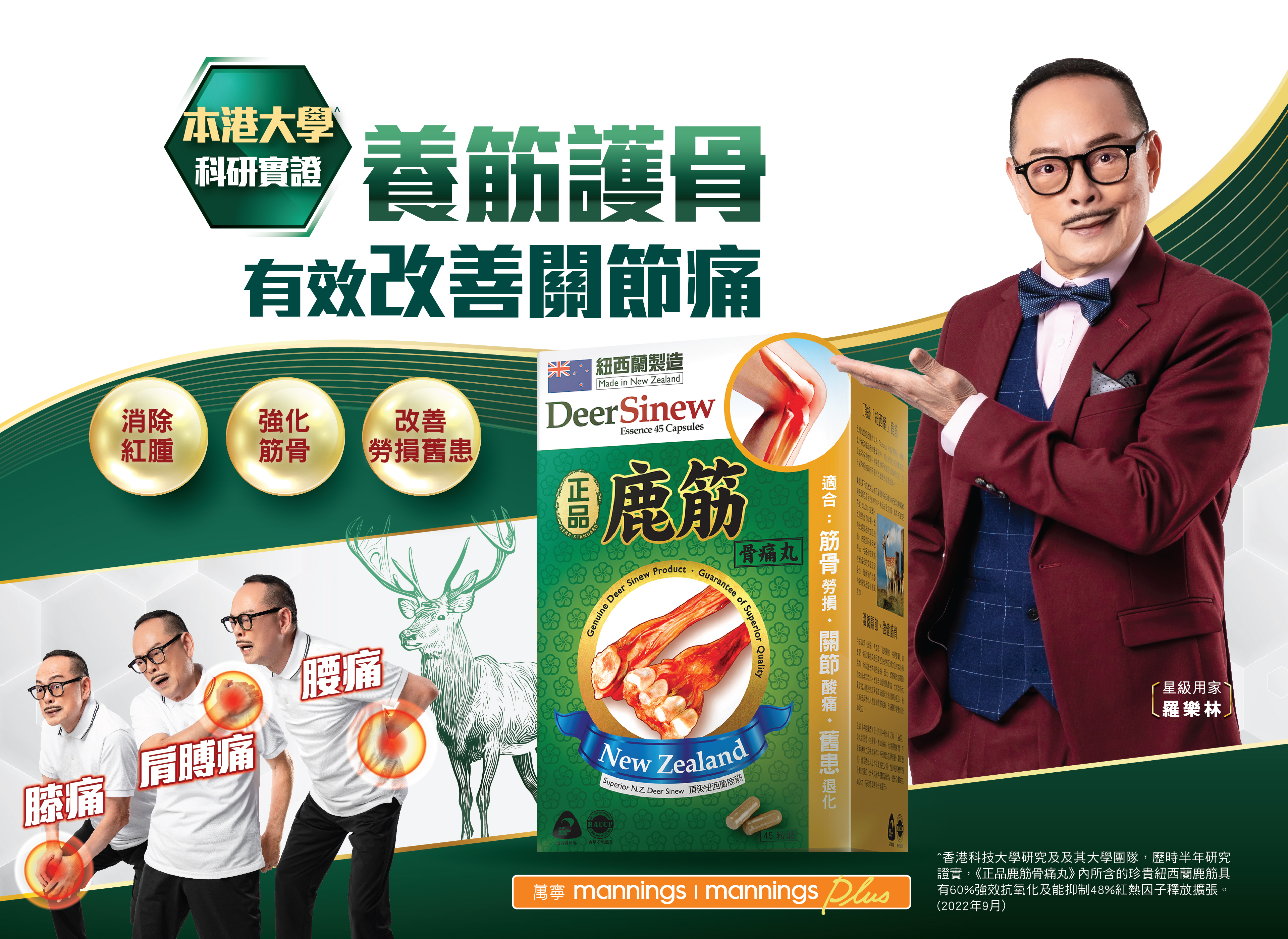 ^香港科技大學研究及開發公司執行細胞研究測試《正品鹿筋骨痛丸》內所含的珍貴紐西蘭鹿筋具有60%強效抗氧化及能抑制48%紅熱因子釋放擴張;針對改善關節勞損、舊患、慢性退化等問題。