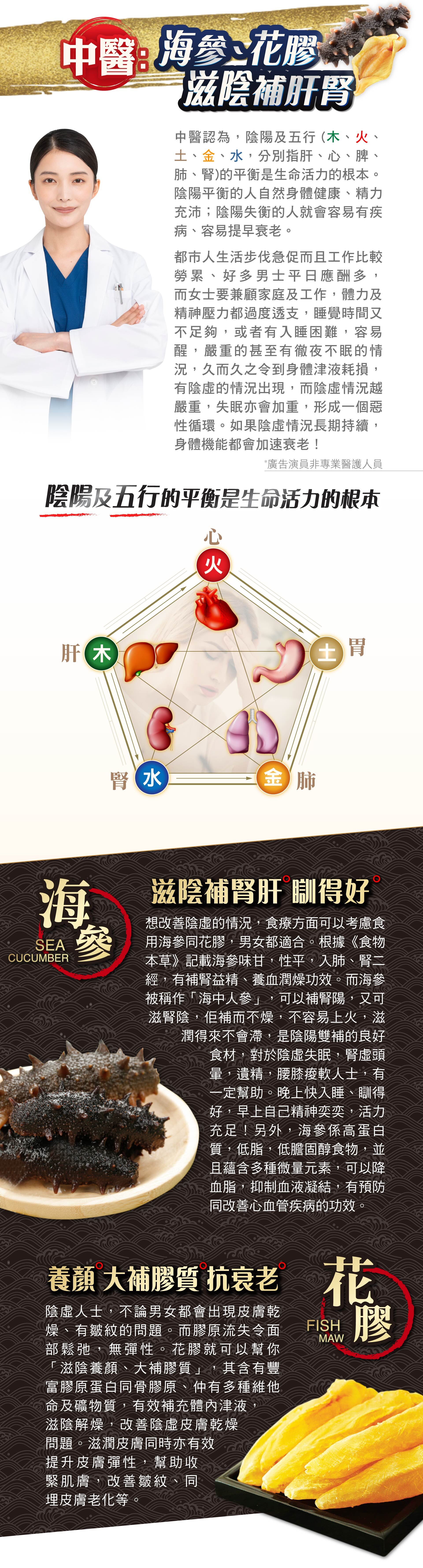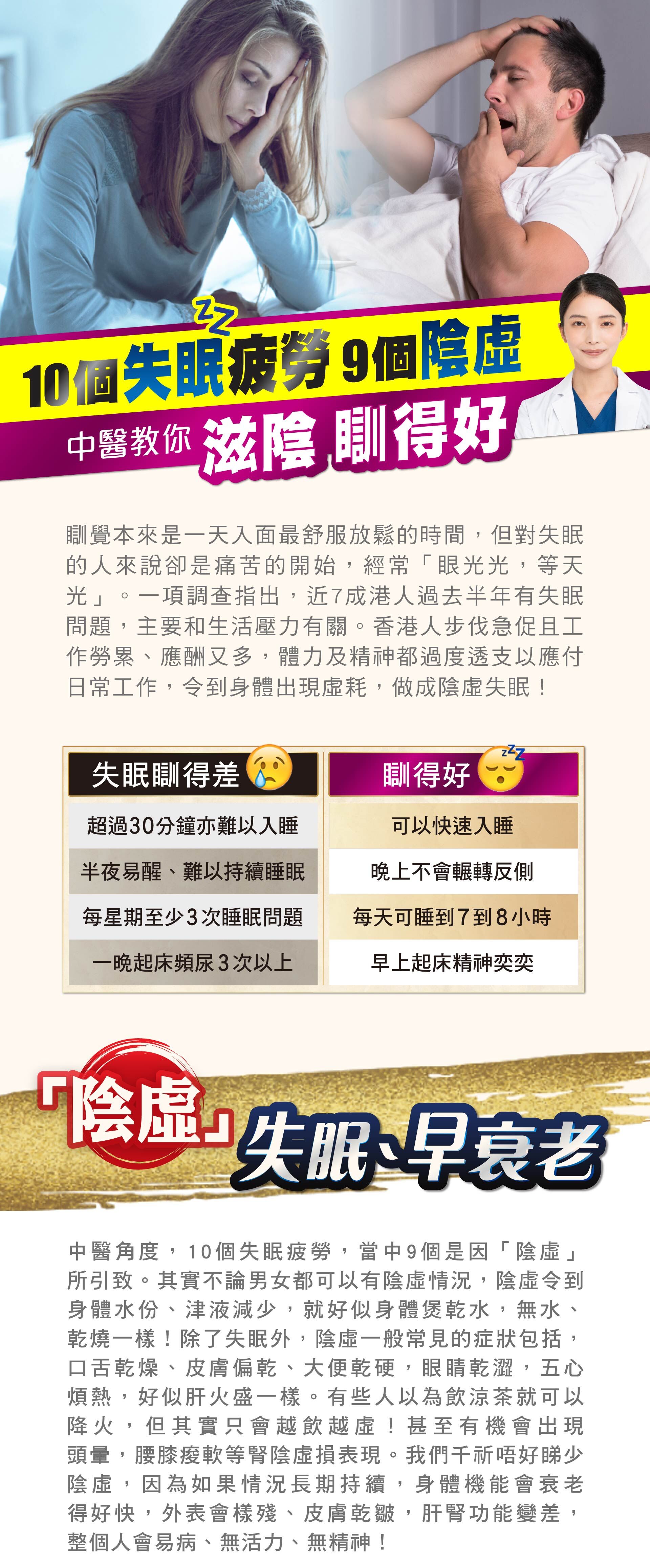 都市人過度透支精神體力,以應付工作日常,加速身體虛耗,形成「陰虛」。「陰虛」對男女影響極為深遠,津液持續虛耗,使人體乾枯、陰陽失調,外表和肝、腎機能均未老先衰,引發各種健康問題,如失眠、體虧易病。因此要及早改善陰虛,首要為身體注入營養素,讓身體補回所虛耗的,滋陰補肝腎、養顏補膠質!