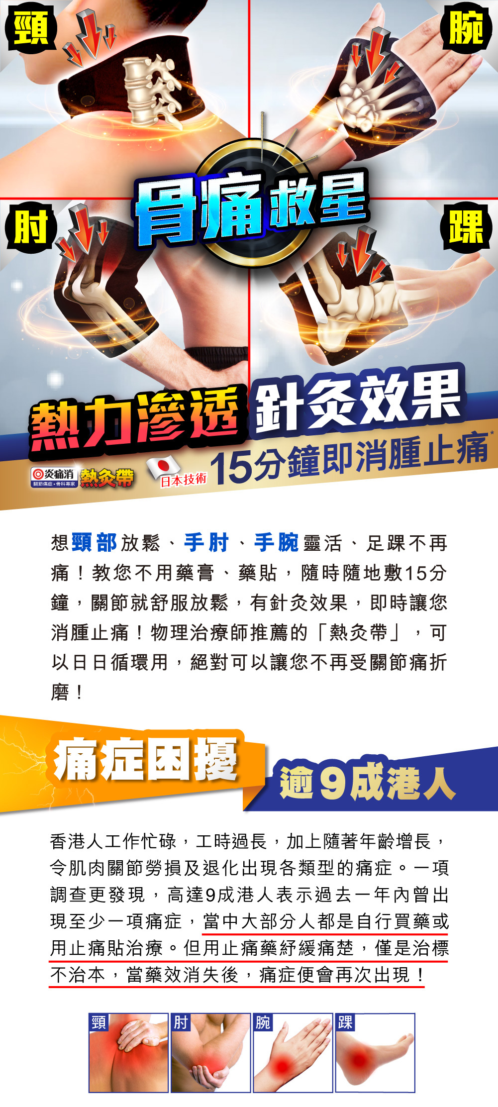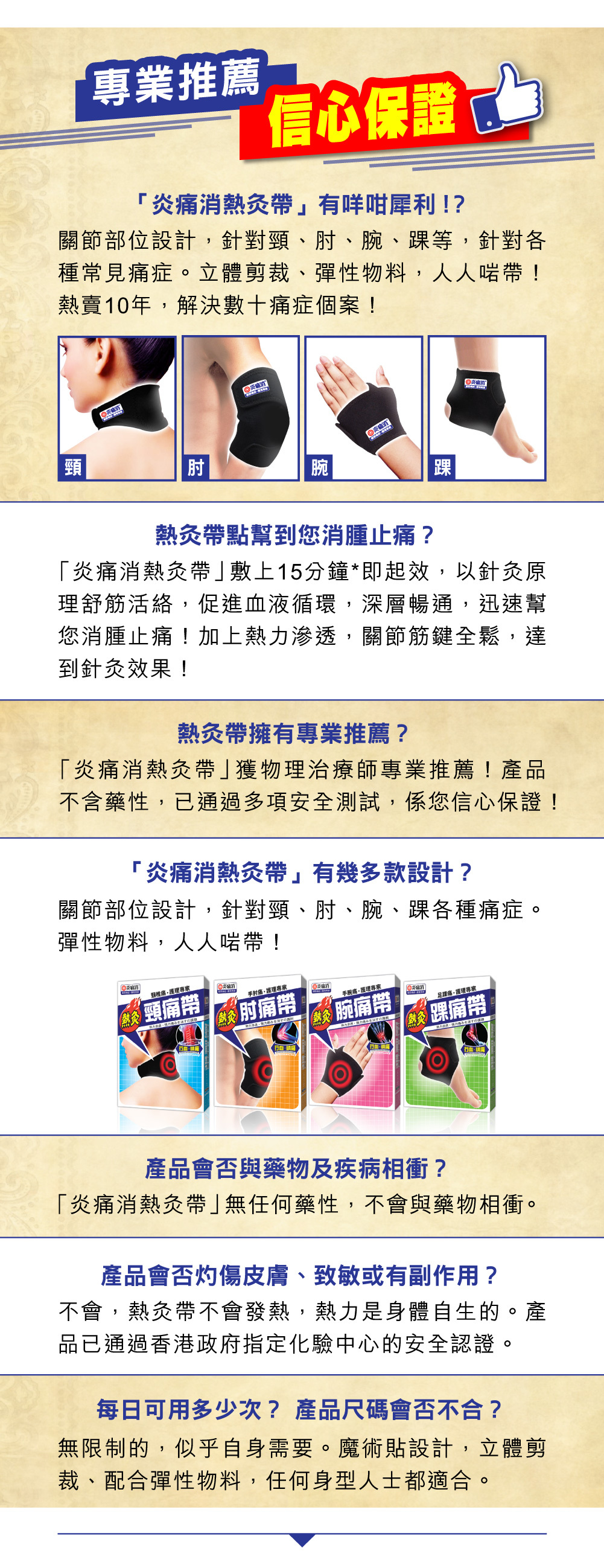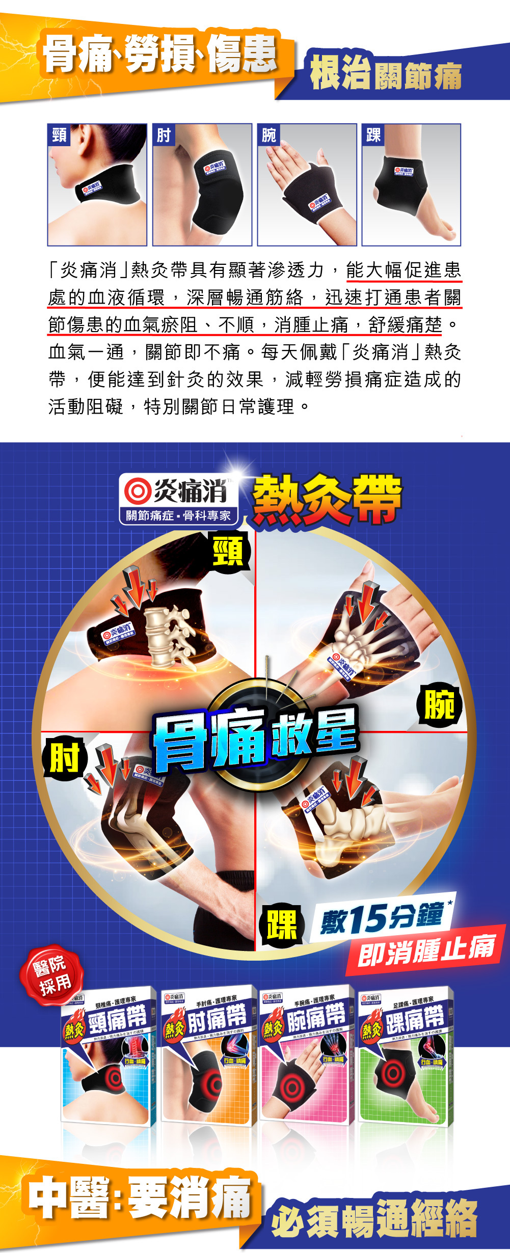 「炎痛消肘痛帶」以針灸原理舒筋活絡,促進血液循環,深層暢通筋絡,打通手肘傷患的血氣瘀阻、不順,迅速消腫止痛,特別針對肘部骨痛、勞損、傷患、關節退化。熱灸帶不含藥性,並通過有關致敏、致癌物、重金屬及輻射等多項安全測試,證實安全可靠,無副作用,可重複使用。