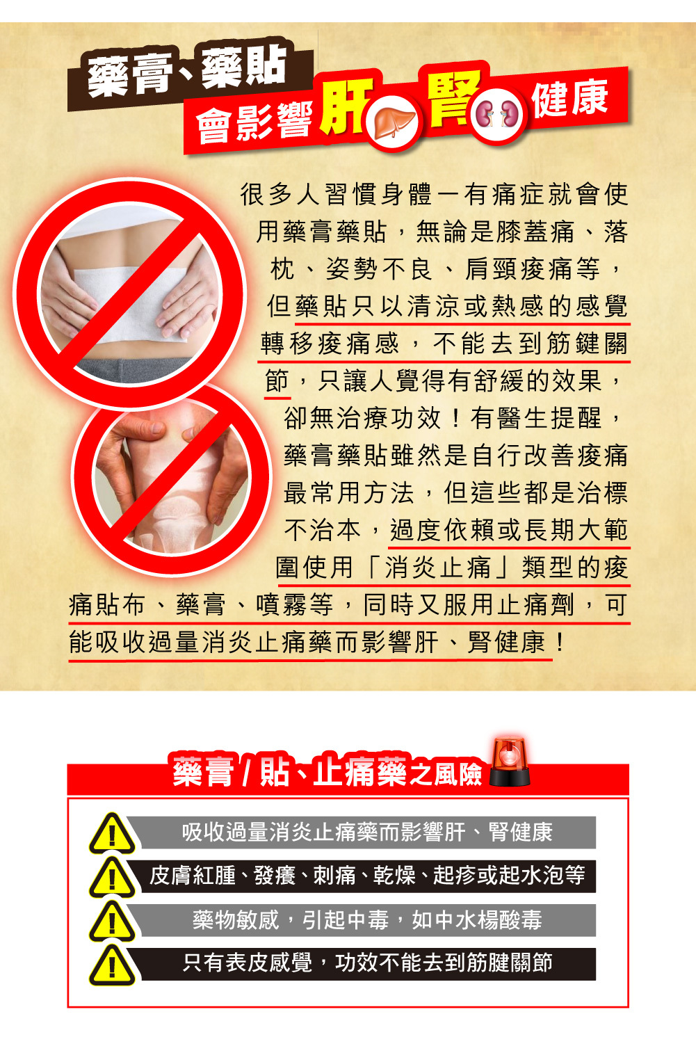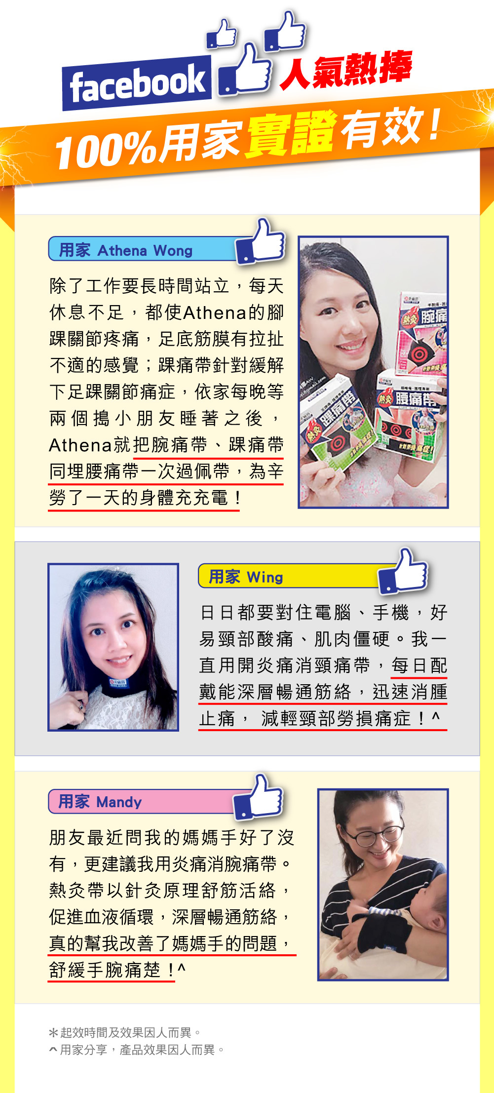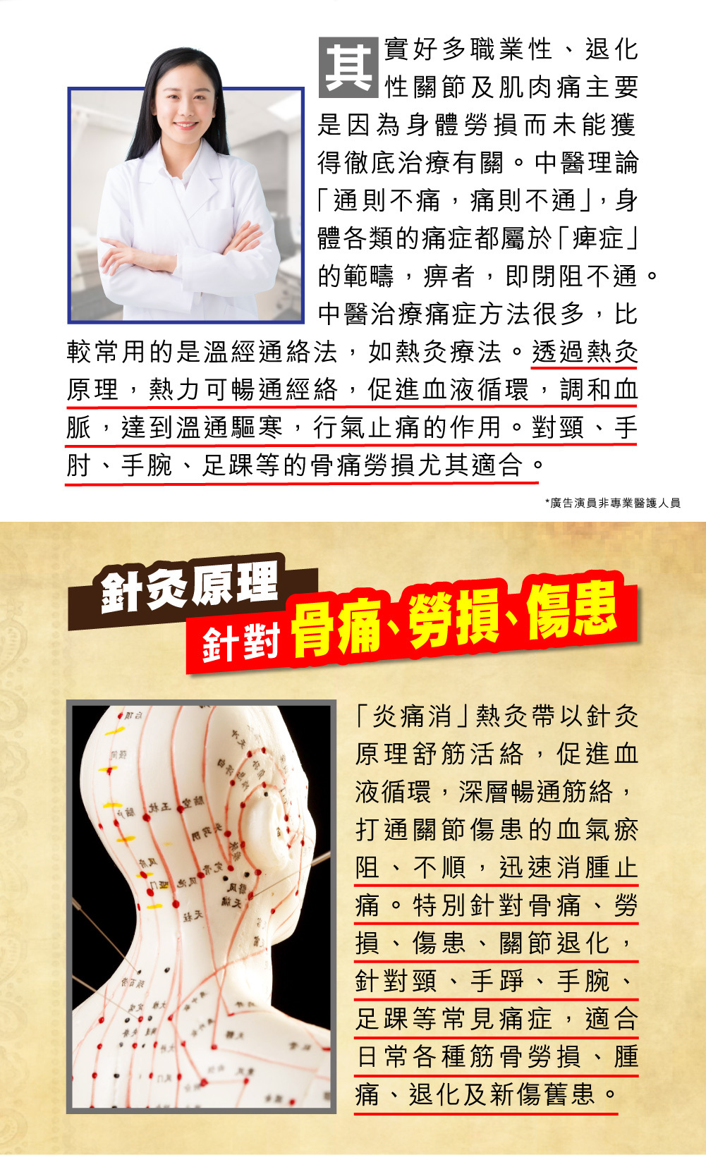 「炎痛消肘痛帶」以針灸原理舒筋活絡,促進血液循環,深層暢通筋絡,打通手肘傷患的血氣瘀阻、不順,迅速消腫止痛,特別針對肘部骨痛、勞損、傷患、關節退化。熱灸帶不含藥性,並通過有關致敏、致癌物、重金屬及輻射等多項安全測試,證實安全可靠,無副作用,可重複使用。