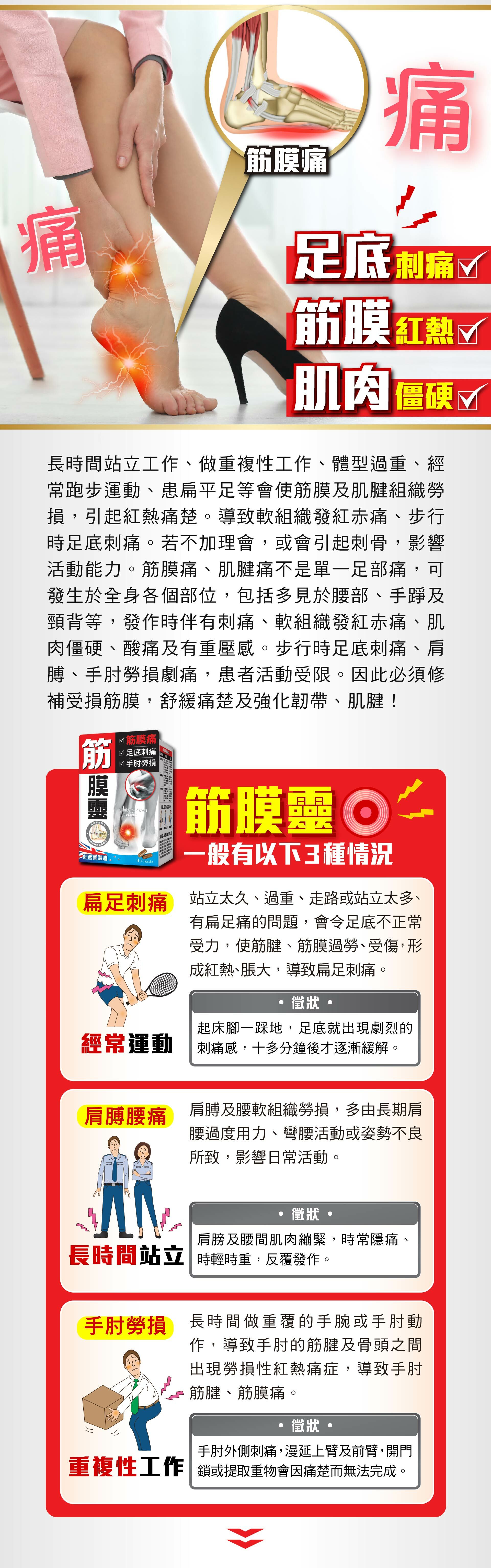身體退化、長時間站立工作、做重複性工作、體型過重、經常跑步運動等會使筋膜及肌腱組織勞損,引起紅熱痛楚。導致軟組織發紅赤痛、步行時足底刺痛、肩膊、手肘勞損劇痛。若不加理會,或會引起刺骨,影響活動能力。