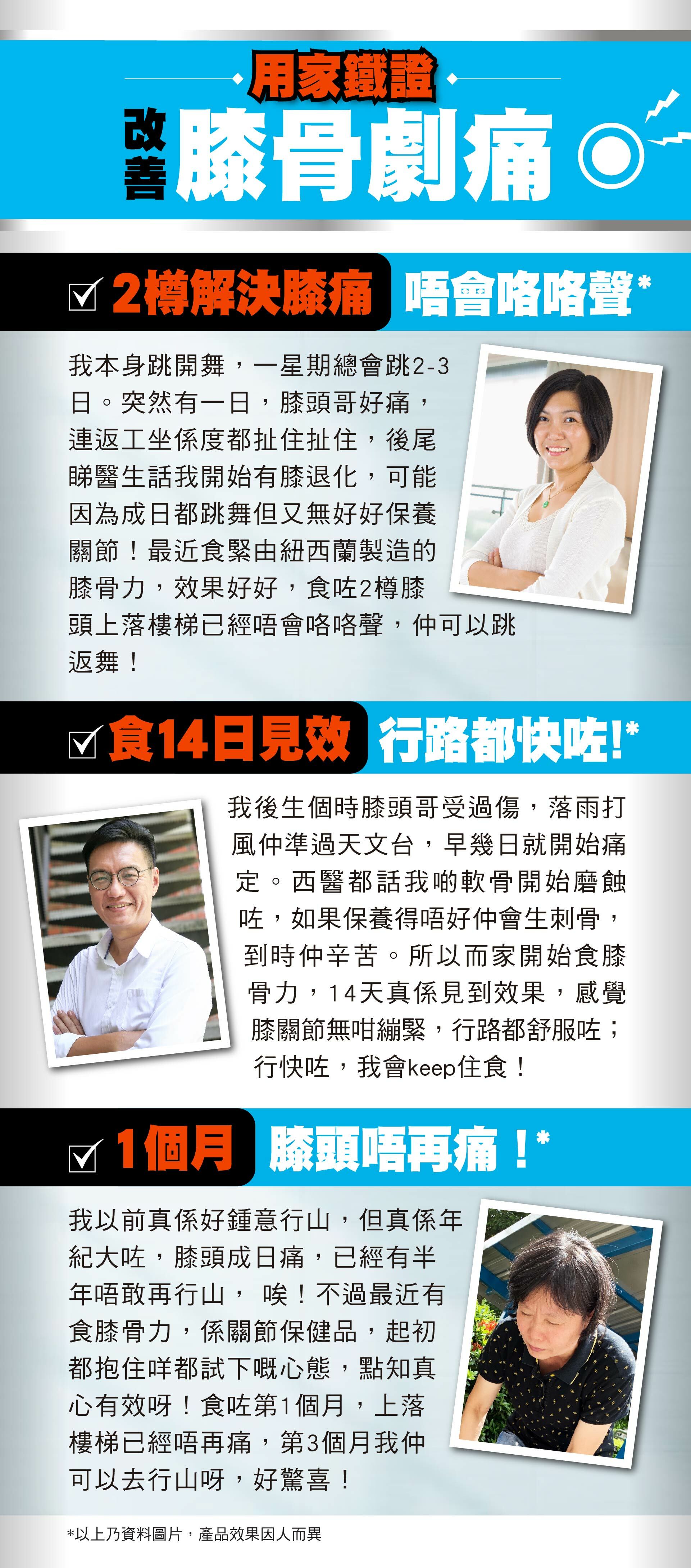 年紀增長、體形過重、舊患復發或過度運動等都是關節退化引起濕風痛的重要成因。若膝痛惡化,會引致軟骨磨蝕,造成刺骨問題。不但會出現上下樓梯無力,關節咯咯作響,甚至使雙腿屈曲攣縮、無法伸直,寸步難行。要根治痛源,必須消除紅腫痛熱、補軟骨抗磨蝕及延緩關節退化,讓關節重返年輕。