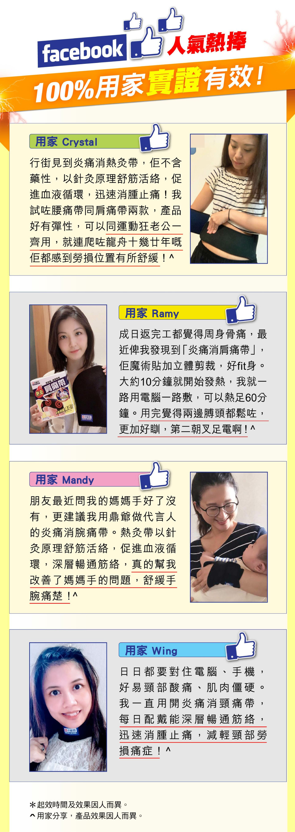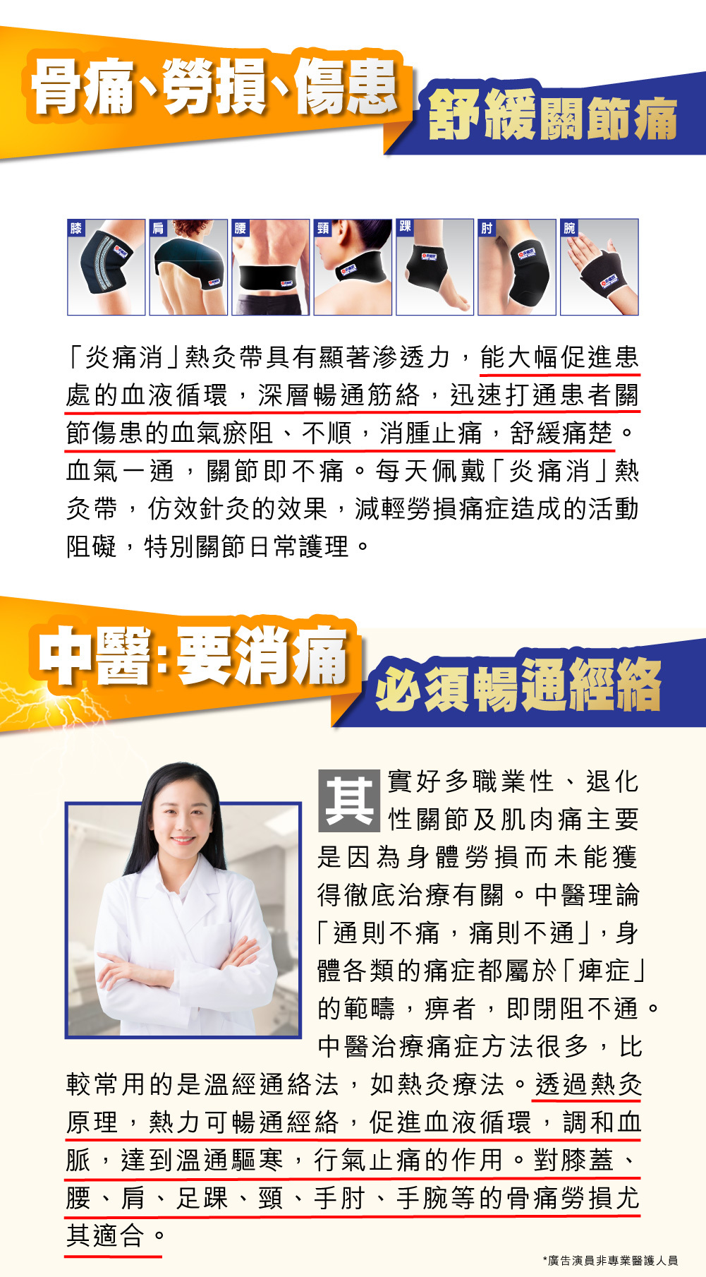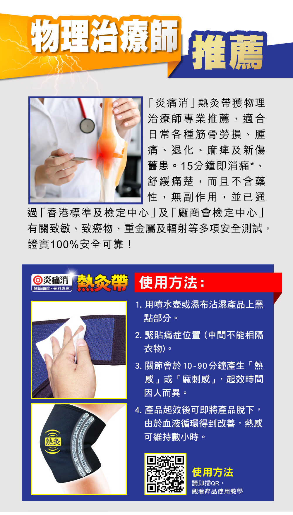 「炎痛消腰痛帶」以針灸原理舒筋活絡,促進血液循環,深層暢通筋絡,打通腰痛傷患的血氣瘀阻、不順,迅速消腫止痛,特別針對腰痛、腰肌勞損、腰傷患或退化。熱灸帶不含藥性,並通過有關致敏、致癌物、重金屬及輻射等多項安全測試,證實安全可靠,無副作用,可重複使用。